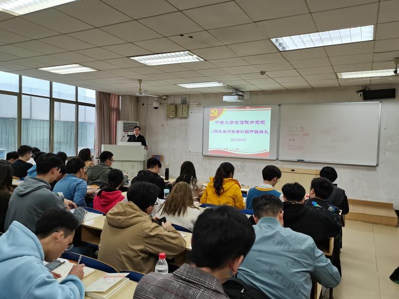 地信院分党校第12期发展对象培训班开班典礼在校本部科教南楼307举行。开班典礼由培训班班导师杨通田老师主持,院党委副书记李建军老师出席会议,培训班全体67名学员参加了本次开班典礼。