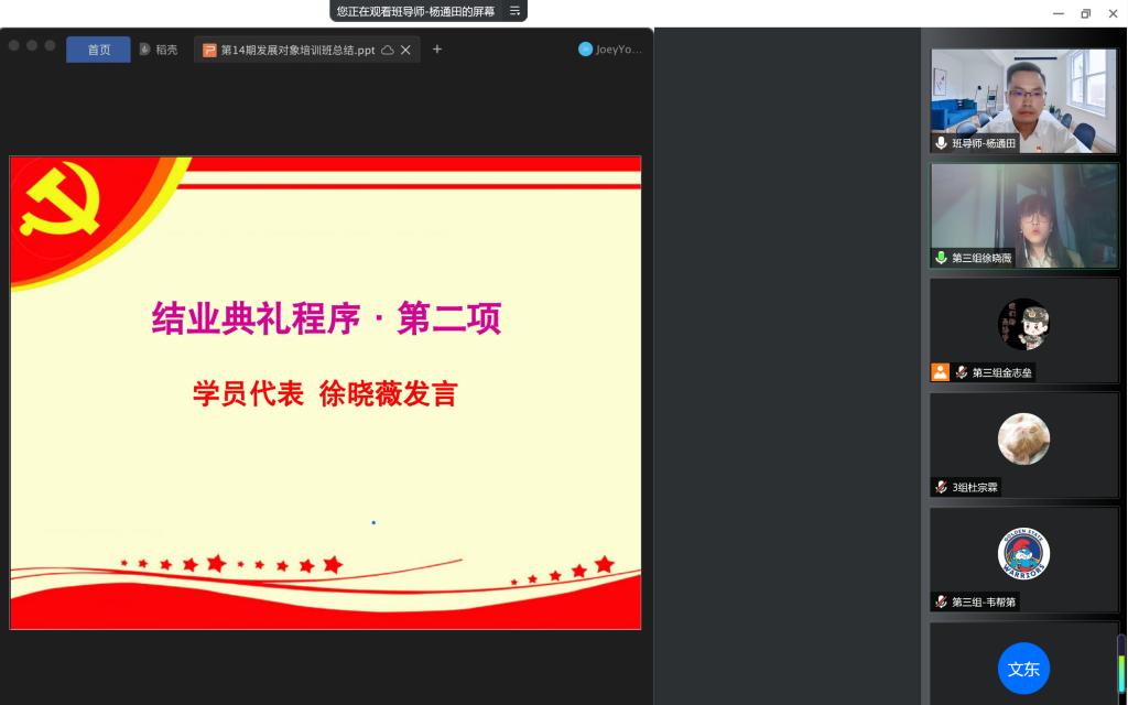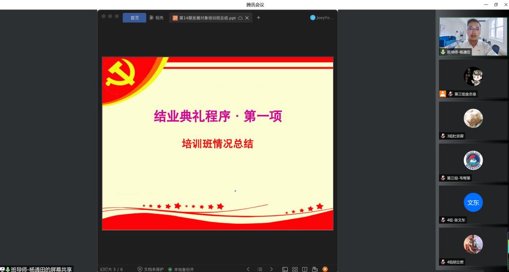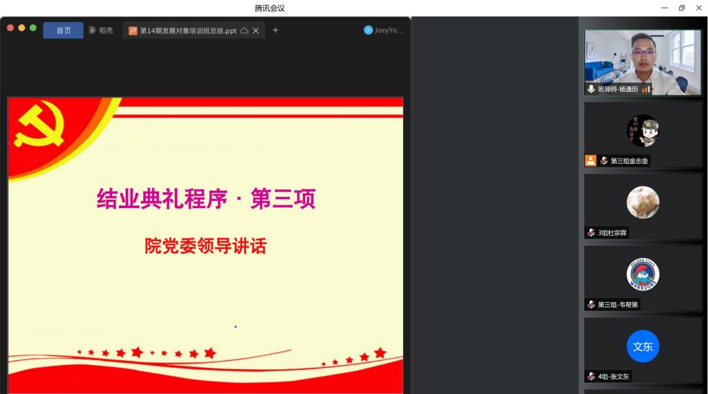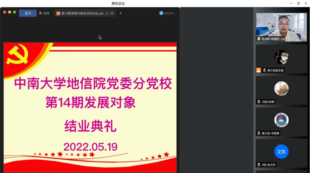 地信院党委分党校第14期发展对象结业典礼以线上会议的方式顺利举行。本次结业典礼由培训班班导师杨通田老师主持,培训班全体67名学员参加。