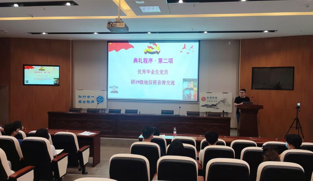 会议第二项,优秀毕业生党员先进事迹报告会。优秀毕业生党员研19级地信班音涛同学作主题汇报。音涛同学分享了自己在初入中南时的故事,自己在思想、学习、生活等各方面的成长与收获,对老师们和学校对他的帮助表示感谢,并提到自己因此受到了良多启发,进步颇深。他总结道,作为青年应当为国家和社会做贡献,用青春打造美好中国,奋进新征程,建功新时代。