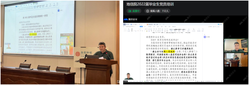 会议最后,学院党委专职组织员彭光雄老师向毕业生党员们讲解了《给2022届毕业生党员同学的一份信》,期间详细介绍了党组织关系转接的具体流程、注意事项以及转接过程中可能出现的问题,同时,对大家提出的相应问题做出了现场解答。