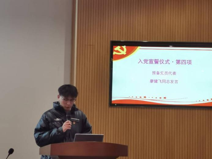 会议第四项,预备党员代表廖健飞同志发言。廖健飞同志代表全体预备党员真诚地感谢学院党委的悉心培养和党支部同志的关怀帮助,向党组织表明了坚定不移跟党走的决心。