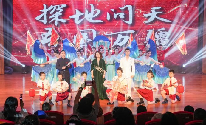 该节目以探地问天的科技报国精神为核心,将地球科学学科特色融入舞台艺术童声、流行、美声、京剧、扇舞与旗舞有机融合,各绽光彩。童声合唱拉开序幕,娓娓道来,明亮清澈。女教师们一袭青绿长裙,以柔美扇舞翩然登场,她们手持扇轻盈翻转,层层叠叠流动线条勾勒出如《千里江山图》一般的秀丽景象。主唱部分流行与美声跨界演绎,精心编排的和声跌宕起伏,委婉动听,红日霞光仿佛在歌声中浑然一体。清脆的板声打破抒情的氛围,男教师们踏着京剧节奏举旗登场。京剧唱段改编自经典作品《定军山》选段,铿锵锣鼓声中,新编唱词探地宝、绘碧霄、凿岩峤、问天高韵味流转,与大屏幕上学院科研攻关的创新瞬间、课堂教学的生动画面、师生共创的累累硕果相映生辉旗舞阵阵,在刚柔并济间诠释学科魅力展现出地信师生丈量大地、逐梦深空的豪情。尾声全员合唱,热闹非凡,舞台灯光汇成星河,探地问天吾国万疆的京剧念白气势如虹,将现场气氛推向高潮。