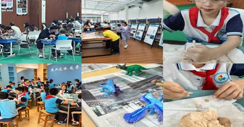 第一附属小学体育馆,举办了“国际化石日”暨古生物科普大型宣传活动。第一附小一百多名在校三年级小学生参与了此次“化石游园会”活动,全校师生参与了化石科普展的活动,活动覆盖人数超500人。