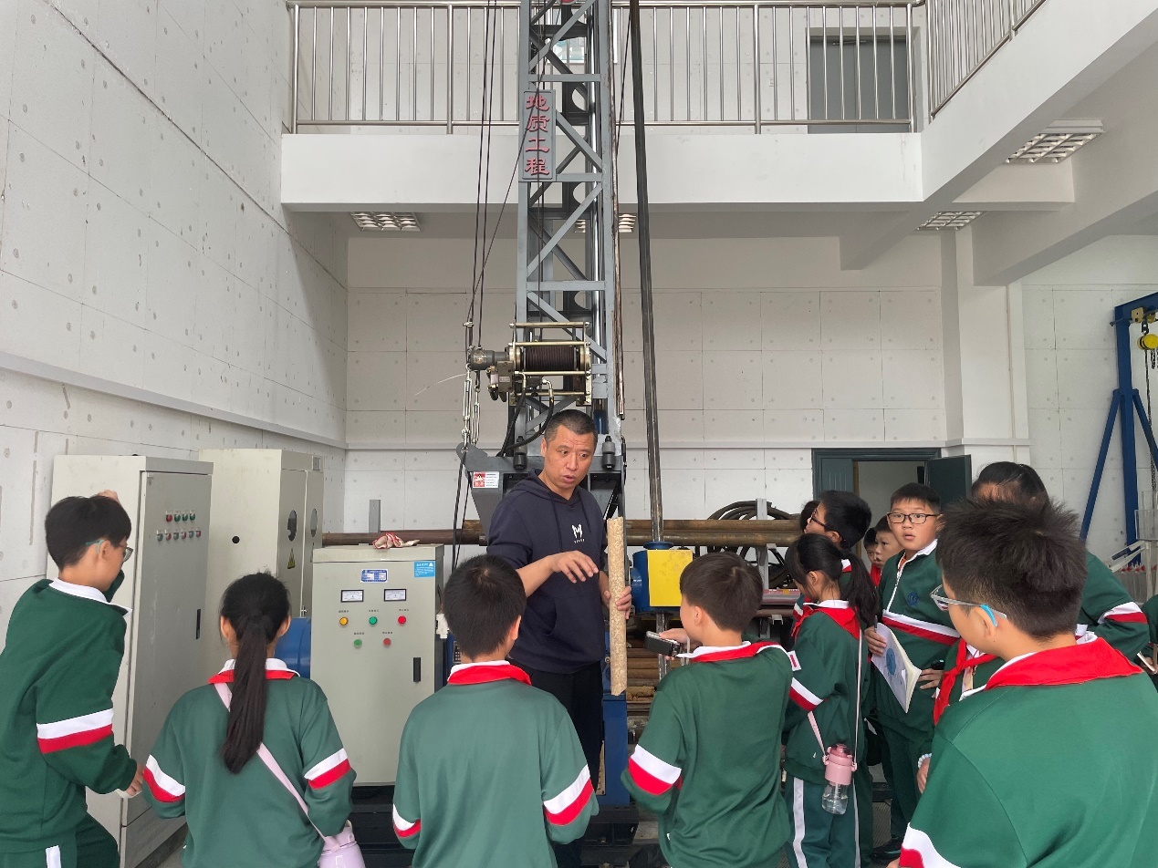 随后同学们来到了水文地质实验室,在匡老师的讲授下,同学们了解了典型地质灾害的成因和危害,引导孩子们保护地质环境。最后小朋友们跟随刘老师来到了钻探工程实验室,了解了深地钻机的结构及工作原理,刘老师实际操作钻机,让孩子看到了模拟采集地球深部岩心岩样的过程。