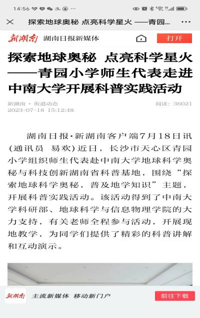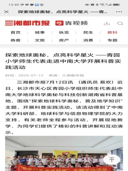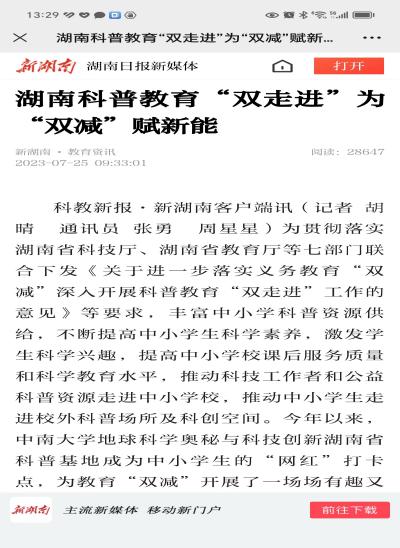 2023年5月24日,2023湖南省科技活动周启动,湖南卫视午间新闻特别报道宣传了我基地。随后,湖南日报、三湘都市报和长沙晚报等相继报道了中小学生来我科普基地开展研学活动的新闻。
