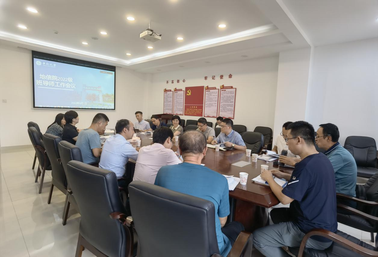 9月1日下午14:30,地信院2022级班导师会议于地科楼214会议室顺利召开。地信院党委副书记李建军,副院长邹滨,学工办副主任胡幽,辅导员刘琦、杨通田、彭璐、刘凯及地信院22级全体班导师以“线下+云端”形式共同出席会议。