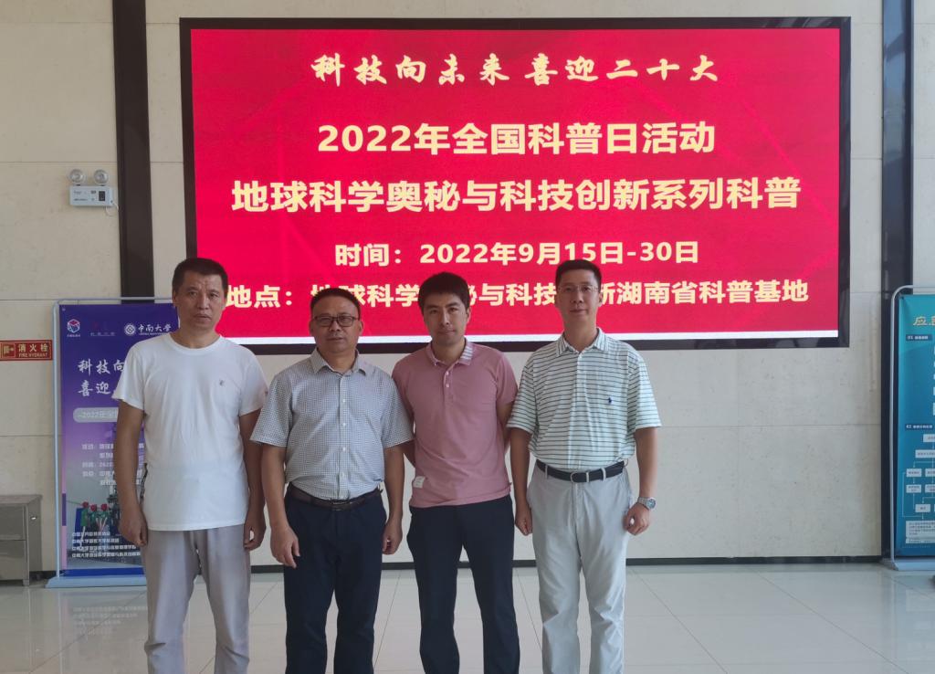 ,视察指导地球科学奥秘与科技创新湖南省培育科普基地建设运维情况,学院副院长张绍和、学校科研部王李昌、地质工程系书记刘磊磊、主任孙平贺、学院实验中心刘井鹏、匡立新、地质工程系曾兰等陪同。
