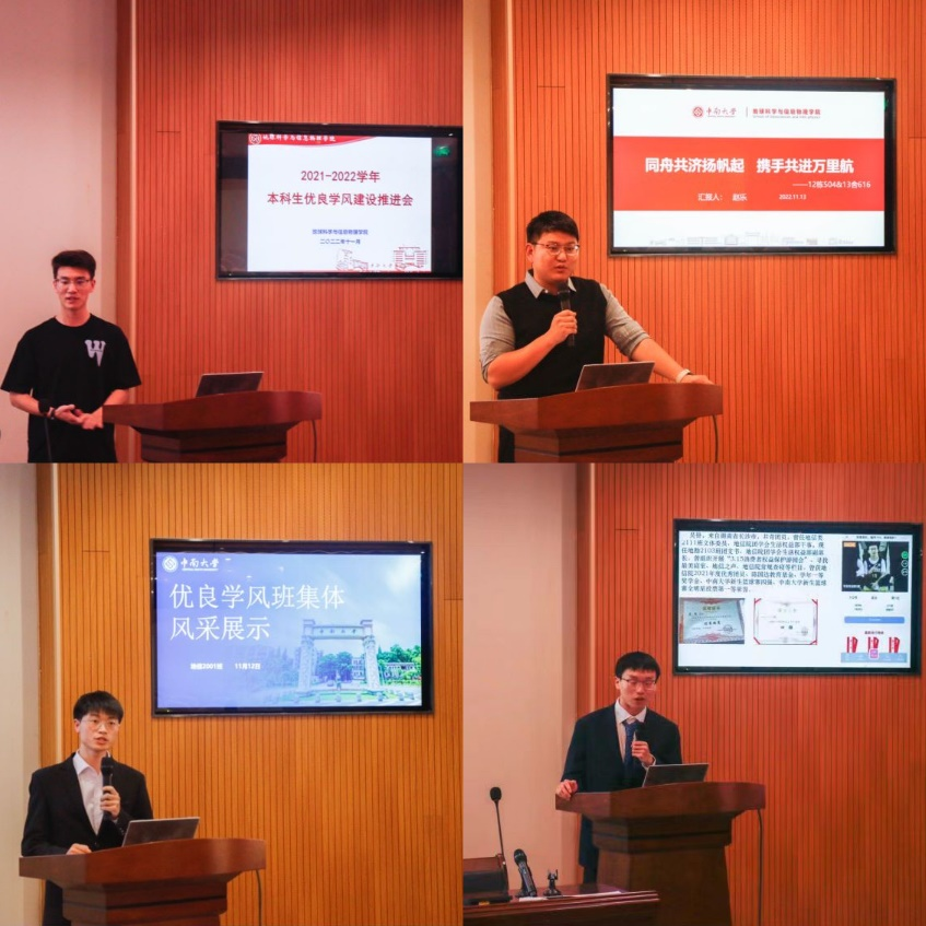 颁奖仪式后,地信类2102班班导师助理刘德旭分享自己学生工作中的成长与收获;地信2001班班长黎俊杰就建设班级优良学风进行了交流分享;升华12栋504寝室长赵乐对寝室成员成长历程和学风建设经历进行了介绍;互助帮扶先进寝室的寝室长吴钋分享了寝室互助帮扶的经验。
