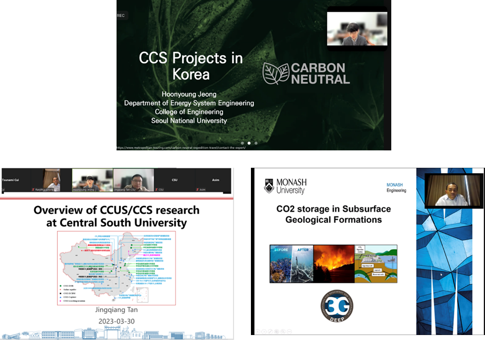 Hoonyoung Jeong教授做了题为《CCS Projects in Korea》的报告,介绍了韩国CCS主要进展,特别是首尔大学团队围绕韩国两大CCS项目所开展的各项研究,包括:基于深度学习的盐水萃取井位优化、东海气田CO2注入过程盐沉淀及结垢物影响评价、基于物质平衡方程的CO2封存能力评估和CO2注入作业条件优化等。P.G. Ranjith教授做了题为《CO2 storage in Subsurface Geological Formations》的报告,展示了澳大利亚Otway、Gorgon、South West Hub等CCS项目的执行情况,着重介绍了其团队在深部咸水层CO2封存领域的研究成果和科研实力。谭静强教授做了题为《Overview of CCUS/CCS research at Central South University》的报告,介绍了CCUS/CCS对我国实现碳中和的重要性、我国主要CCUS/CCS项目进展和团队针对超临界CO2压裂与封存一体化、CO2-页岩/CO2-流体-页岩相互作用等领域所开展的系列研究。随后参会人员进行了深入探讨,碳中和是中、韩、澳都高度关注的议题,三方均表示希望未来可以深化交流与合作,充分发挥各自团队特点和优势,助力早日实现各国碳中和目标。最后,三方约定进行线下会议,进一步商讨落实合作交流事宜。