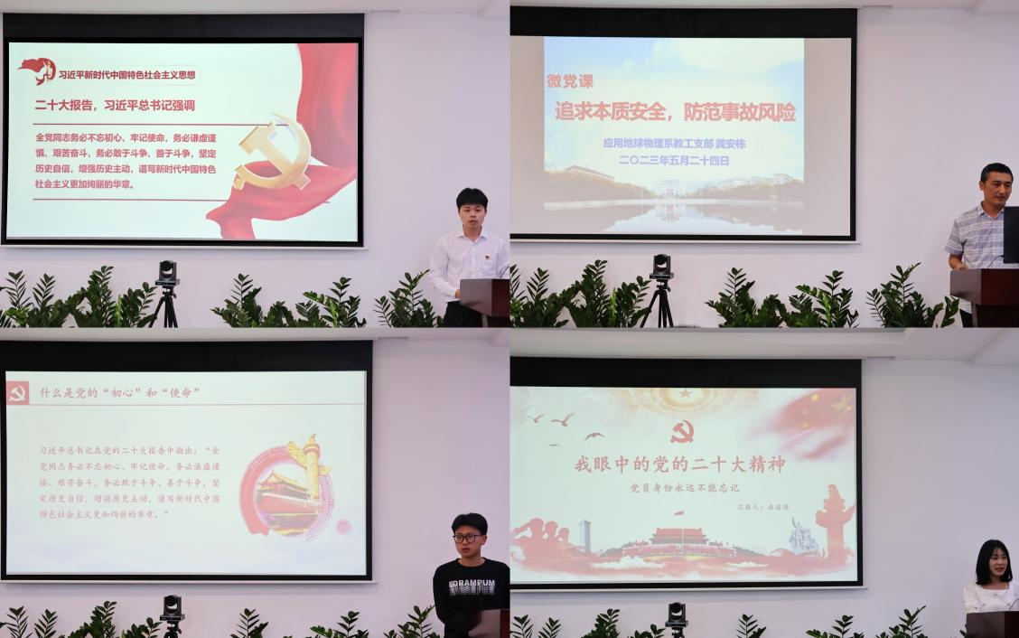 为深入学习贯彻习近平新时代中国特色社会主义思想,全面学习贯彻党的二十大精神,巩固深化“不忘初心、牢记使命”主题教育和党史学习教育成果,地信院于5月24日下午在地科楼214举办学习贯彻习近平新时代中国特色社会主义思想主题教育微党课竞赛。出席本次竞赛的评委老师有地信院党委书记邵拥军老师,地信院党组织干事、党委委员彭光雄老师,测绘与遥感科学系教工支部宣传委员王威老师,分团委书记刘琦老师,院辅导员杨通田老师、杨晨雨老师。参加此次竞赛的有应用地球物理系教工支部龚安栋老师,测绘与遥感科学系教工支部李沈鑫老师以及来自各学生党支部的党员代表,此次竞赛由寇浚哲同学主持。