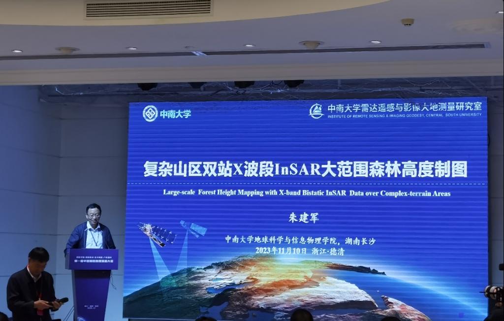 会议期间,朱建军教授在“测绘地理信息安全与雷达卫星遥感”分论坛作了题为《复杂山区双站X波段InSAR大范围森林高度制图》的报告,着重介绍了其课题组在穿透测绘上取得的成果和进展,获得了现场专家同行的高度认可。