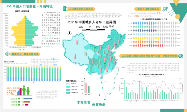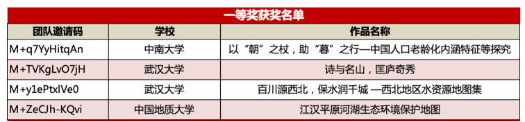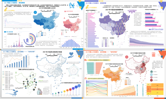 地理信息系21级本科生有5项作品在此次大赛中获奖(包括一等奖1项,二等奖1项,优胜奖3项)。其中,由赵玲老师和侯东阳老师指导,李丹枫、吴雨蒙、黄博、汪海杰四人提交的作品“以朝之杖,助暮之行-中国人口老龄化内涵特征等探究”从全国500多个作品中脱颖而出,荣获本届大赛制组图第一名。