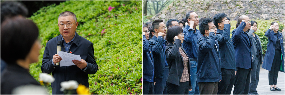 随后,全体师生代表拾阶而上,向先辈雕像敬献花束。在地质资源系博士生支部书记熊伊曲老师的带领下,全体师生代表高举右拳,庄严宣誓。