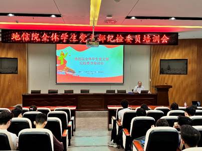 为深入贯彻落实习近平总书记在二十届中央纪委三次全会上的重要讲话精神,全面提升党员的纪律意识和规矩意识,2024年6月19日下午3点,地信院全体学生纪检委员于地科楼127参加培训会议,本次培训由学院党委副书记刘浩担任主讲人。