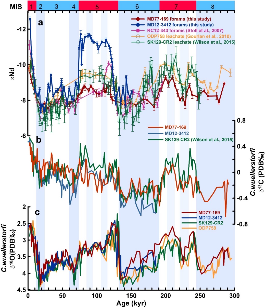 图2. 印度洋海水Nd同位素及底栖有孔虫碳氧同位素