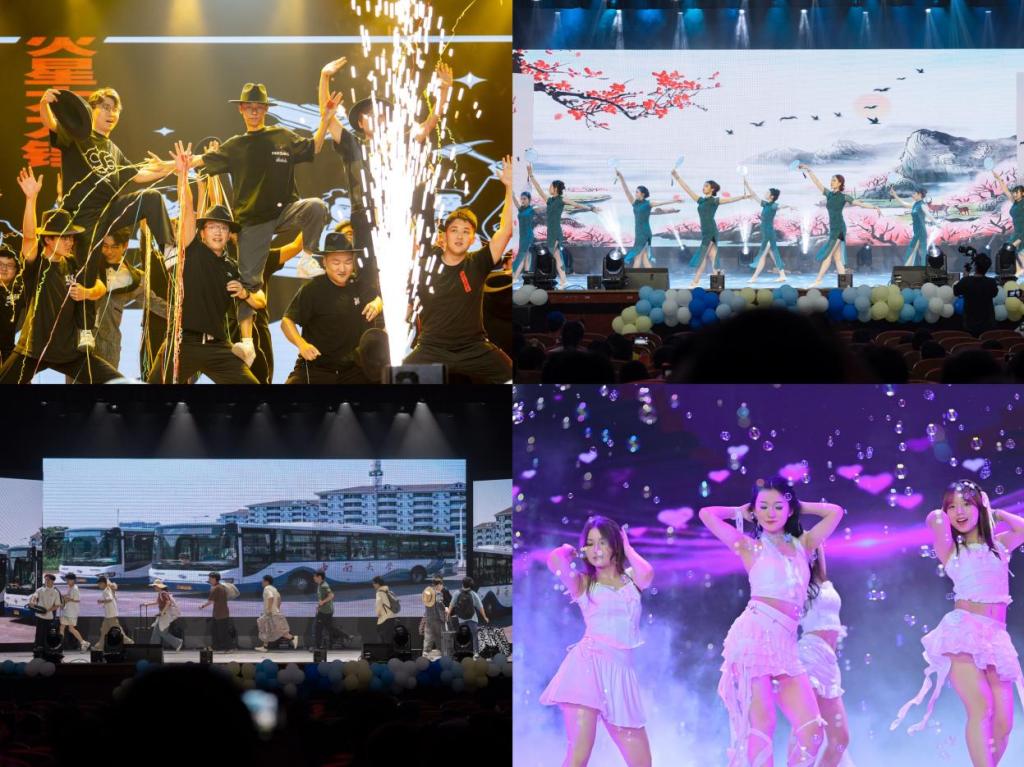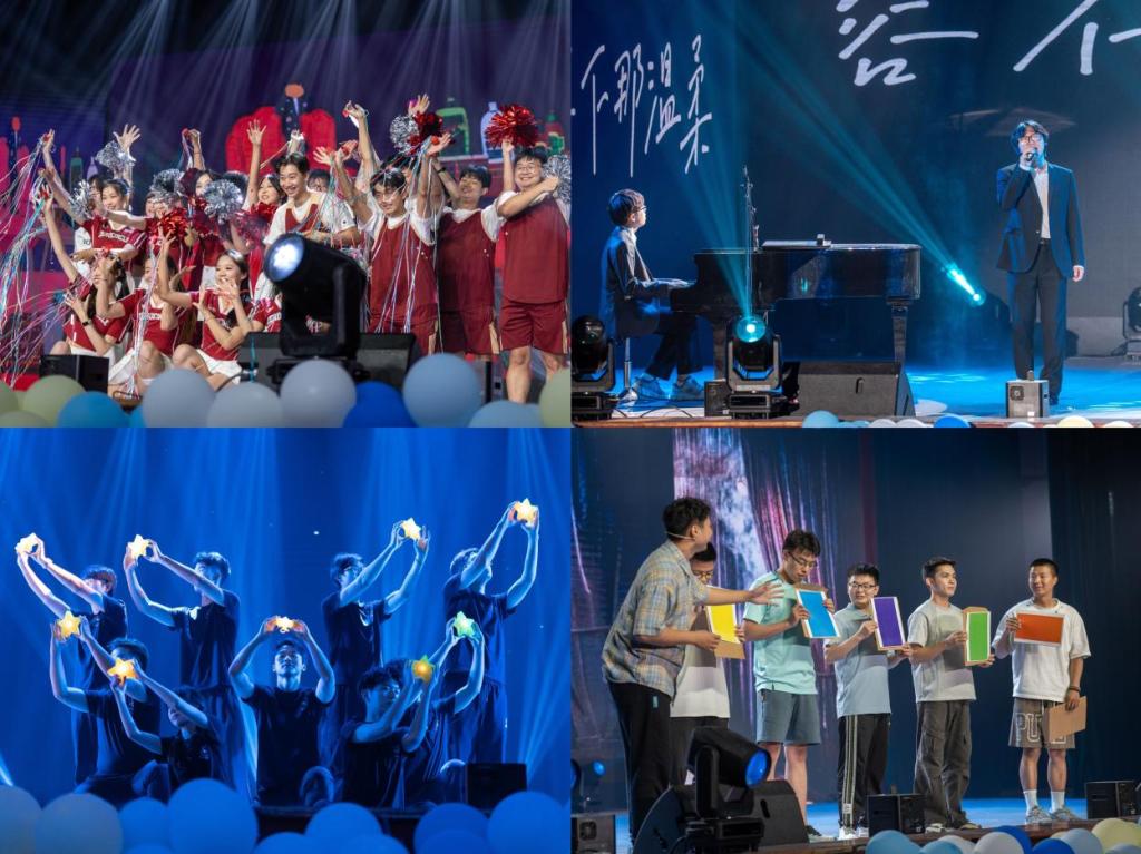 第三篇章“乘风·山海新章”饱含祝福与深情。《乐游双经》以民乐与武术的铿锵协奏,奏响了青春热血与天地柔情;《声生不息》的配音剧场将胶片刻进时光年轮,一句句原声复刻让散落的大学碎片在此刻共鸣;《朋友,干杯》合唱声里,旋律串起同窗点滴,歌声敬过往情谊,愿青春永不散场!