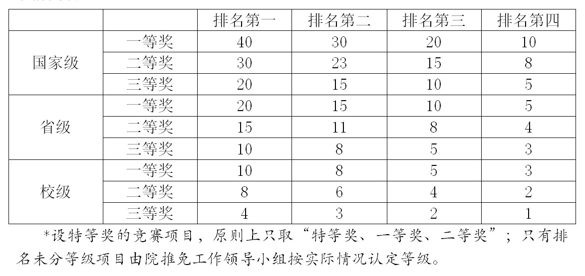 1. 专业学科类竞技竞赛奖(含两类,一类是学校目录中竞赛项目 ,另一类是学院认定的各专业自行增列的竞赛项目)按级别、排名和奖励等级计分,取前四名(获奖人数超出4人时,按高等级优先、同等级学业成绩专业内相对排位靠前优先原则实施)。文体等竞技类比赛(包括学校相关部门及以上单位举办的各类文体竞赛,各类征文、演讲、辩论等比赛项目)按级别、排名和奖励等级计分,取前四名。