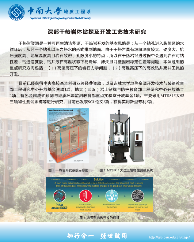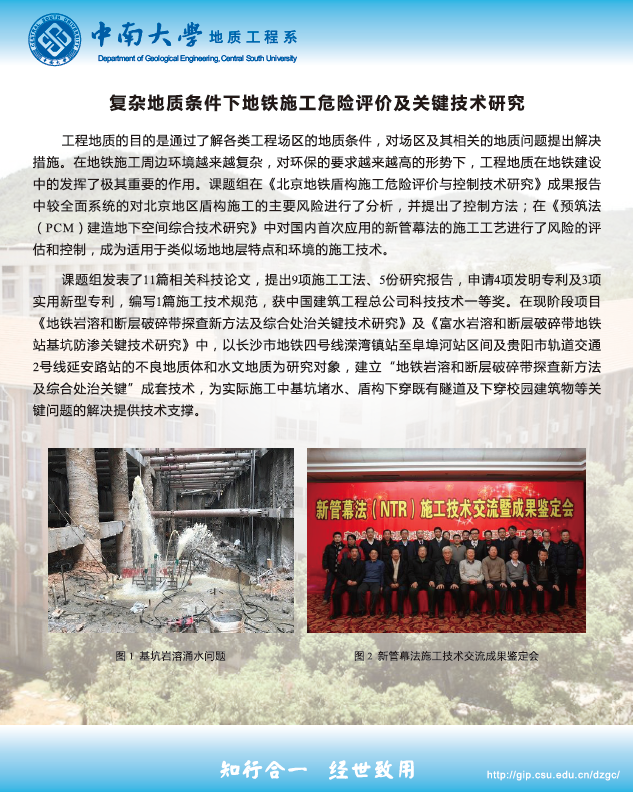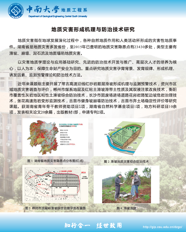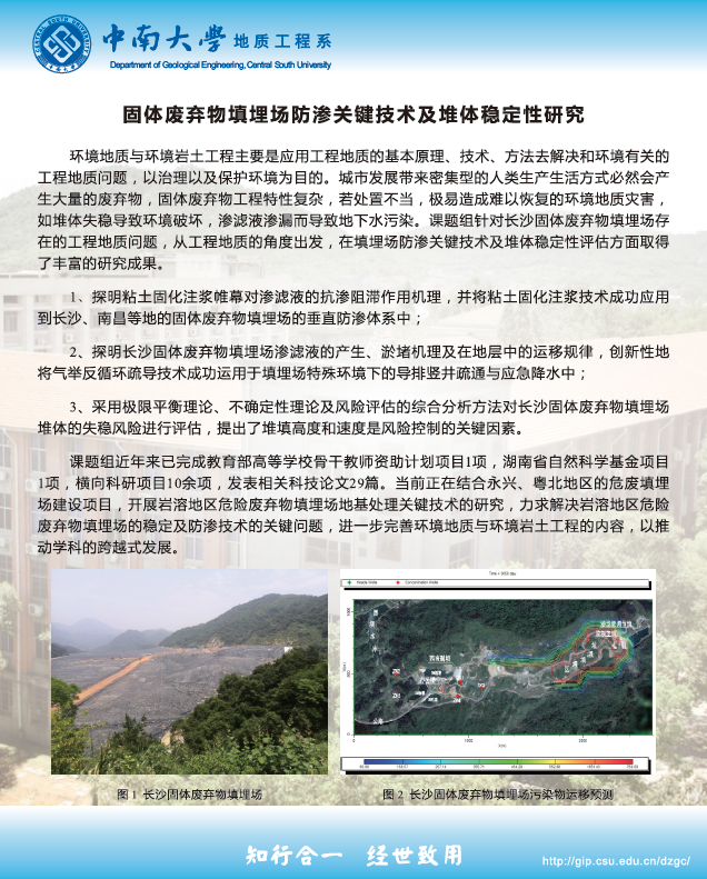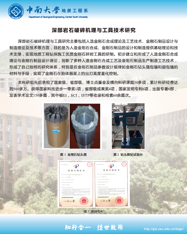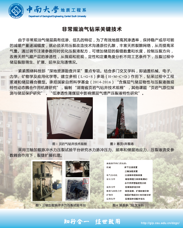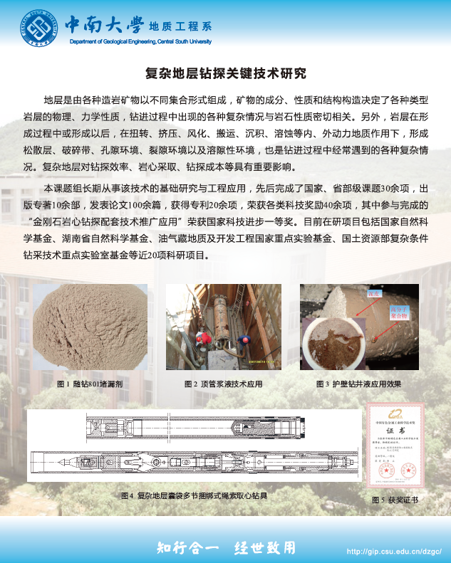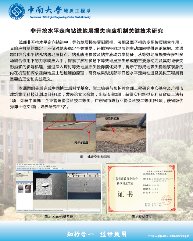 “双一流”建设总体目标和要求,地质工程学科设立了复杂地质工程理论与技术、地质环境监测与灾害防治理论及技术、石油与非常规能源成藏理论与探采技术3个主要方向,同时规划了复杂地质体钻探基础理论和关键技术研究、基于地质体内部损伤及波动检测方法和地质灾害早期预测理论研究、页岩油气赋存富集机理与成藏条件研究、岩溶和断层破碎带地下水处治关键技术研究、复杂地质体(如网纹红土等)的特性研究、固体废弃物填埋场防渗关键技术及堆体稳定性研究、非常规油气储层脉冲水力压裂增效机理与关键技术研究、页岩气水平钻进过程中地质效应及作用机理研究等重点建设项目。