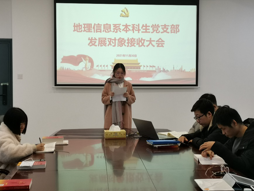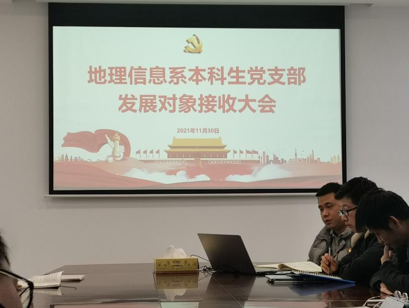 11月30日晚21:00,地理信息系本科生支部于新校区地科楼214会议室进行了地理信息系本科生支部预备党员接收大会。本次会议由强俊同志主持,支部全体同志出席本次会议。