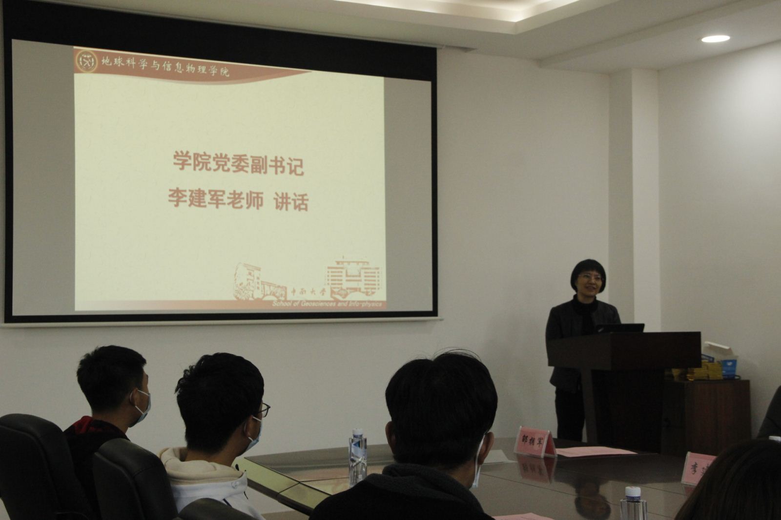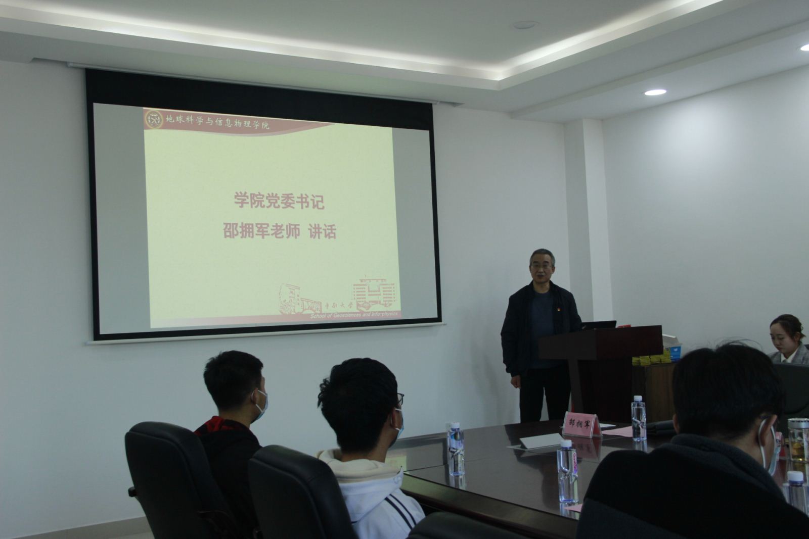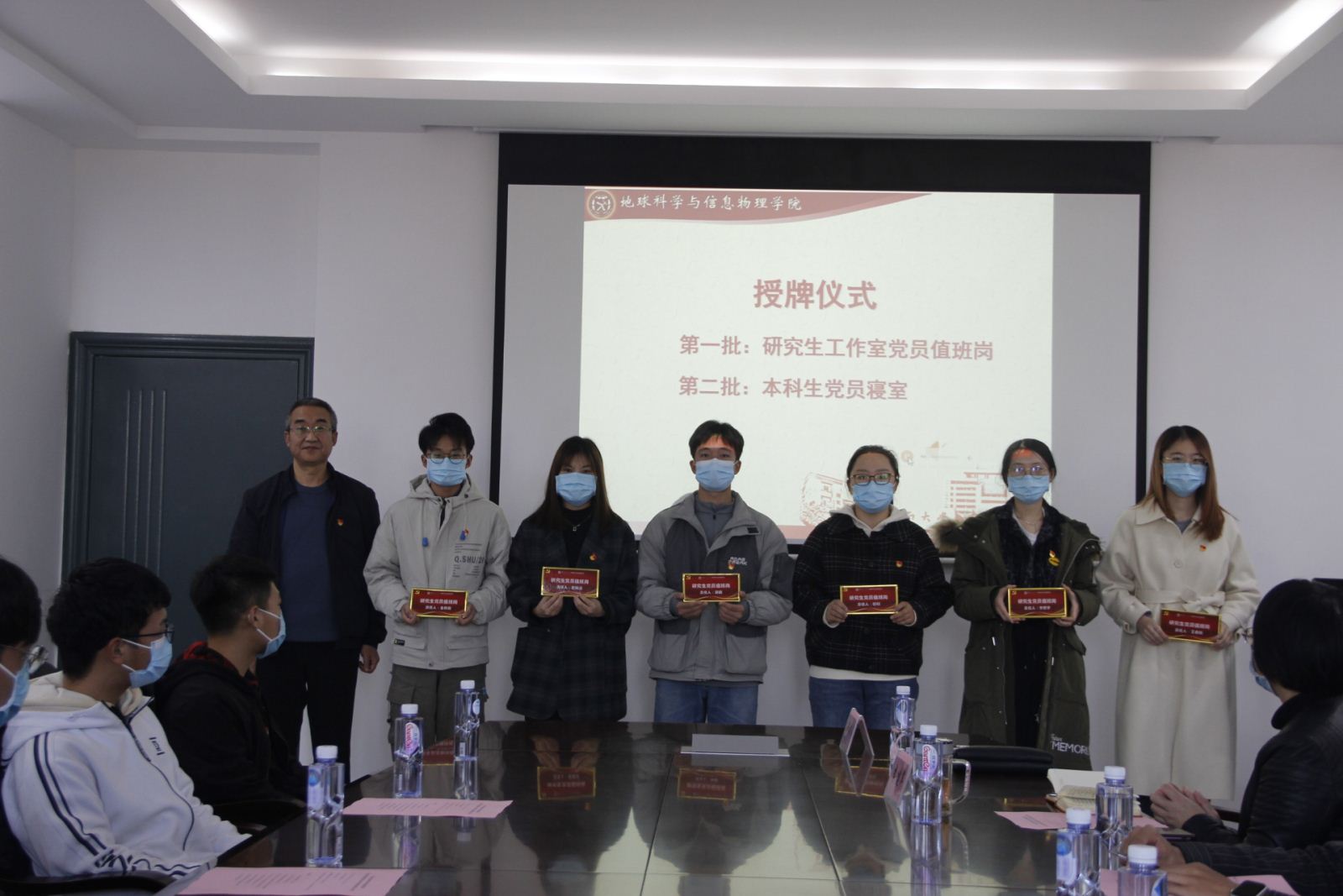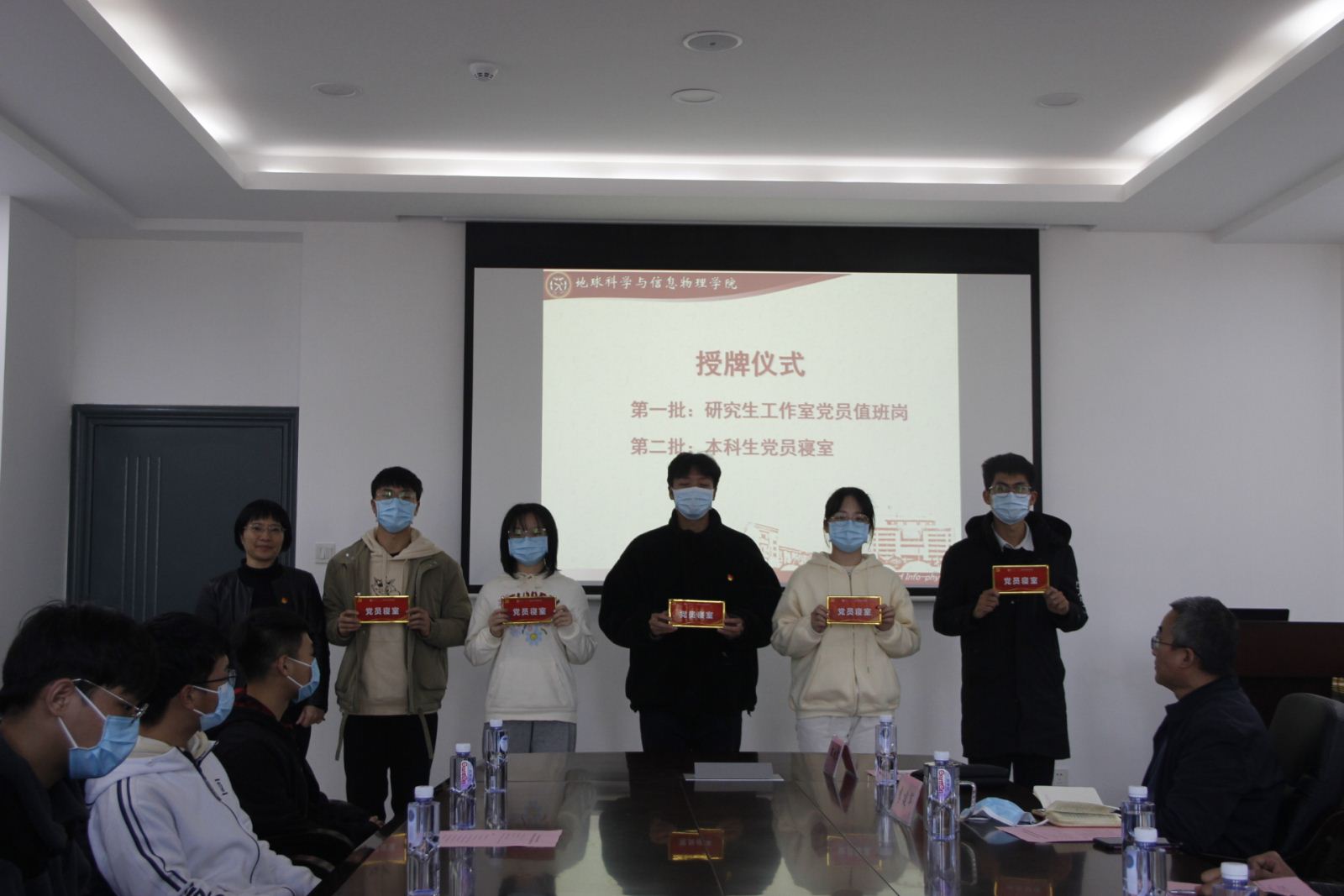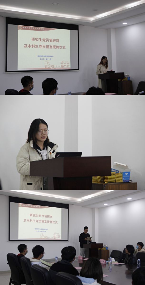 在地科楼214会议室郑重举行了研究生工作室党员值班岗及本科生党员寝室授牌仪式。出席本次授牌仪式的领导老师有,地信院党委书记邵拥军教授,地信院党委副书记李建军老师,地信院研究生辅导员田可老师,地信院团委书记刘琦老师,地信院20级辅导员、地质资源系本科生支部书记杨晨雨老师,地信院20级辅导员、地质工程系本科生支部书记杨通田老师。本次仪式由学院分团委书记刘琦老师主持,研究生及本科生党员代表共同参与。