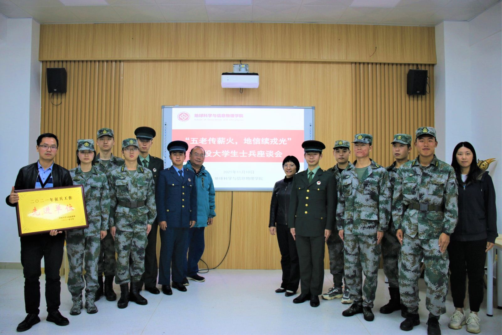 为响应党和国家的号召,传播积极思想,推进大学生应征入伍工作顺利进行,11月10日下午16:00,地信院退役大学生士兵座谈会在新校区地科楼124会议室顺利开展。校关工委副主任兼地信院“五老”辅导员唐建华,地信院党委副书记兼关工委主任李建军,研究生辅导员田可,19级辅导员彭璐,国防教育专干杨通田,地信院关工委秘书杨晨雨以及11位退伍大学生共同参与本次座谈会,有意愿参军入伍的同学也前来观摩、学习经验。