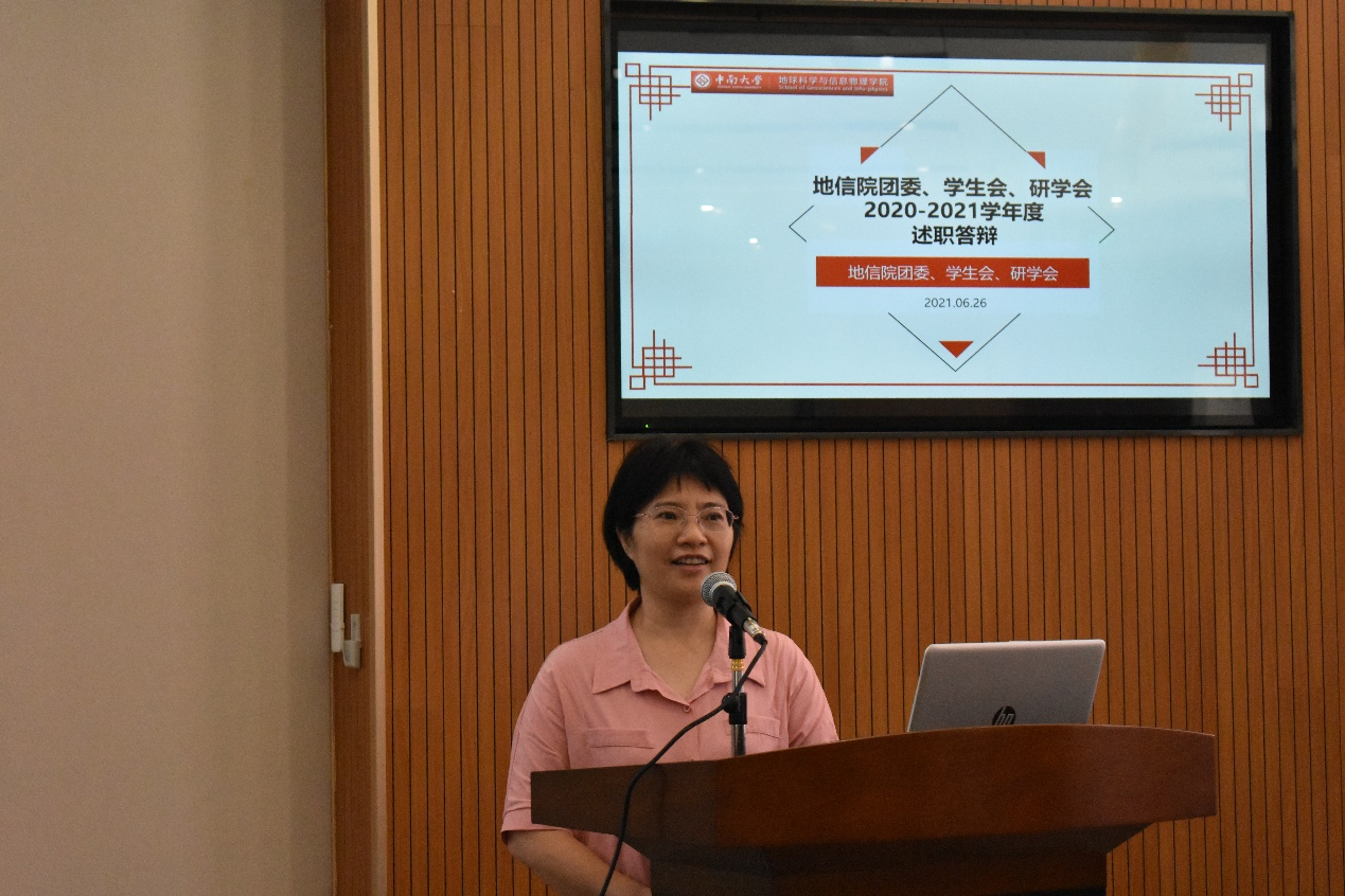 6月26日上午,地信院第十一届团委、学生会、研学会年度述职答辩于新校区地信楼报告厅举行。地信院党委副书记李建军、地信院研究生会指导老师田可、地信院团委书记刘琦出席本次活动。大会由地信院分团委学生副书记李易璋同学主持,地信院第十一届团委、学生会、研究生会全体成员参会。