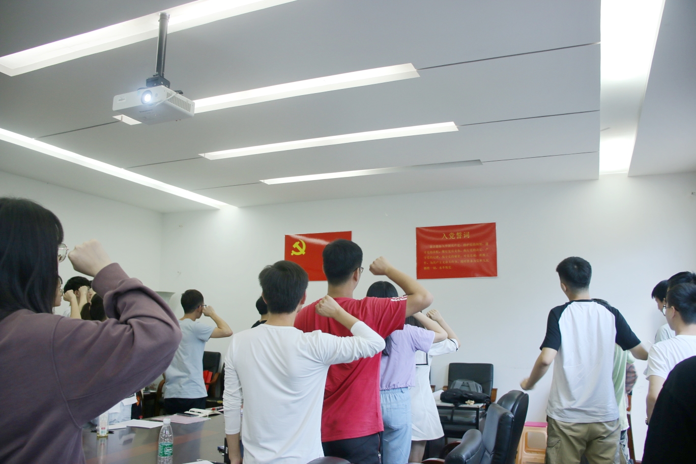 会议最后一项,覃毅学同志带领全体与会党员向党旗宣誓,重温入党誓词。最后,在国际歌的歌声中,地信院地质资源系本科生支部2021届毕业生党员欢送会落下帷幕。