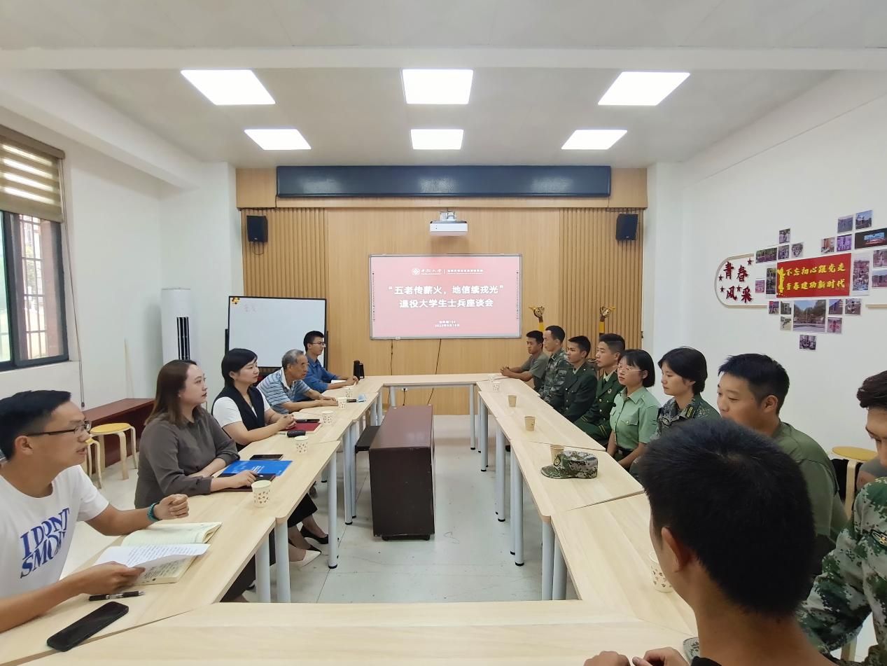 随后,座谈会展开自由交谈,由退伍大学生提出生活、学习中遇到的部分问题,在场的老师们体贴细致地进行解答。杨通田老师又进一步深入阐述了退伍大学生的相关优惠政策,打消了同学们的困惑。紧接着,胡祥昭教授向同学们提出了自己的期盼。胡祥昭教授回顾了自己的军旅与求学的故事,强调从戎经历对锤炼人生有重要意义,并谆谆教诲同学们保持军队作风、适应学习、取长补短,希望同学们发扬戎光、不负嘱托。最后,胡幽老师发言,鼓励同学们将军旅生活转化为学习生活上的坚韧与成熟,不断加强自身素养,成为更加优秀的栋梁之才。语毕,在场的所有人合影留念。