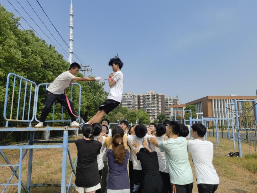力聚背摔台、团结心力齐。在经历了破冰阶段后,同学们热情高涨地前去了素质拓展场地。场地中清风阵阵、欢声笑语,在这里同学们体验了高难度游戏“背摔”,在充分确保安全的情况下培养了同学之间的信任感和团队协作能力。“你累了就换我来保护别人”,在这种轮换下基本上每个人都去体验了这刺激有趣的背摔环节,既考验了团队协作能力,还挑战了同学们诸如体力,耐力等身体条件。