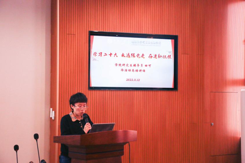 会议第六项,学院研究生辅导员田可老师作活动总结讲话。田老师对在活动中获奖的集体和个人表示了热烈的祝贺,对积极组织本次活动的老师和同学们进行了肯定。同时,田老师也鼓励参会的同学们继续鼓足干劲、扎实肯干,争取取得更加优异的成绩。