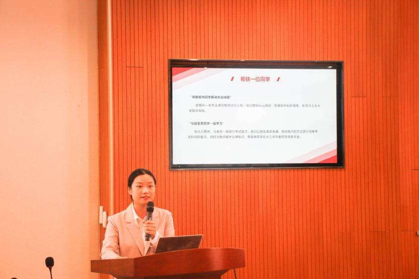 会议第五项,获奖代表李孟垚同学进行主题为“不忘初心,青春永向党”的分享报告,生动形象地向老师和同学们展示了她在过去几年里“担任干部、对接班级、帮扶同学、宣讲理论、服务社会、开展交流、参与项目”等七个方面取得的成绩,为全体参会同学们作出了表率。