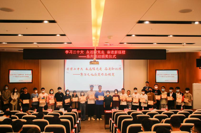 会议第三项,学院副院长邹滨教授为“学习二十大,永远跟党走”——地信院“青春向党‘七个一’”风采展示活动中获奖的选手颁奖并与他们合影留念。