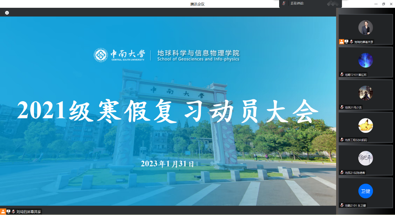 为进一步引导学生尽快调整状态投入到学科复习当中,营造良好的学习氛围,1月31日晚20:00,地信院2021级本科生寒假复习动员大会于线上顺利举行。本次会议由21级辅导员刘琦老师主讲,21级辅导员杨晨雨老师出席会议,全体21级本科生参会。