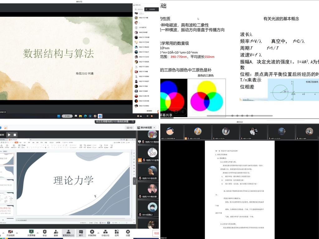 结合专业实际情况,年级针对六个专业的考试科目制定了《晶体光学》、《构造地质学》、《数据结构》、《普通化学》、《理论力学》、《电工技术》、《误差理论与测量平差基础》等七门线上辅导课程,自2月7日起开展了为期1周的专业课直播辅学课程,累计授课时长30余小时。