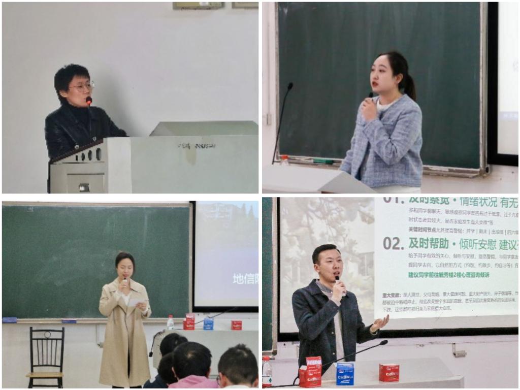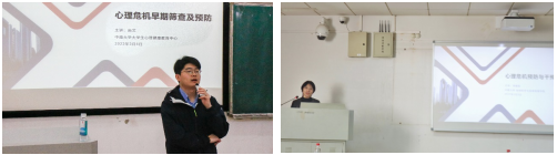 心理中心尚文老师进行心理培训。两位老师围绕“心理危机早期筛查及预防”,为同学们讲解了开展心理工作的重要性以及过程中的注意事项,针对学生在日常学习和生活中可能遇到的心理问题,提出了应对建议。并指出,在特殊时期,例如放假前后以及考试周,应更加关注同学心理状态,对同学的反常行为应及时干预,给予同学更多的关心。