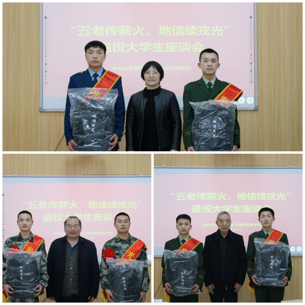 座谈会伊始,杨通田老师介绍了学院近年来征兵入伍工作情况,就学校征兵入伍、退伍政策予以解读。李建军副书记、唐建华教授、胡祥昭教授为光荣退伍及即将入伍的同学颁发“地信戎光”纪念背包。