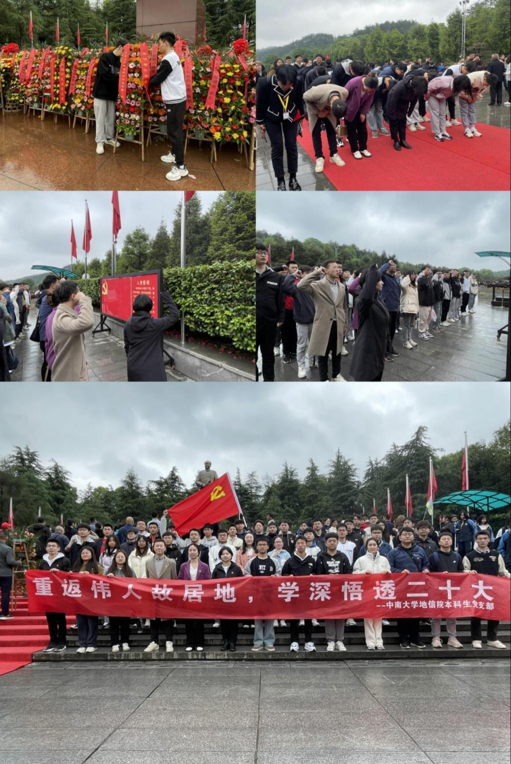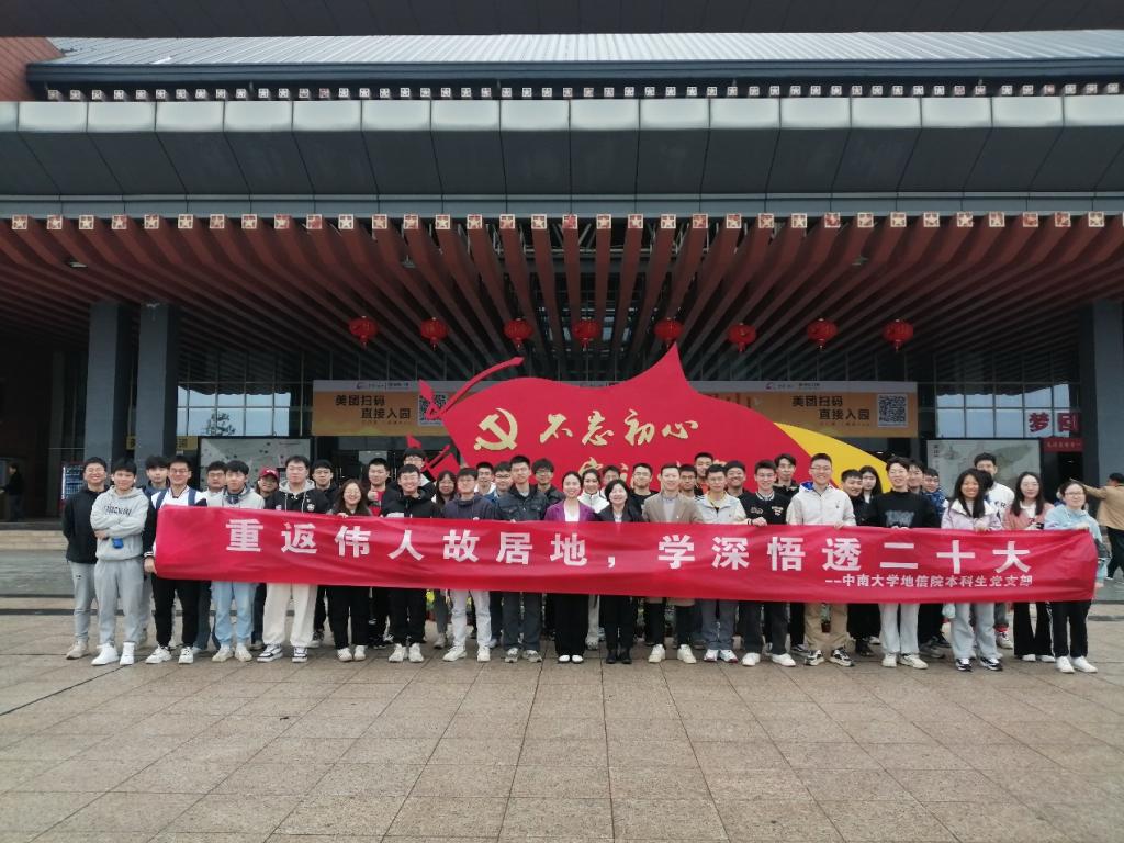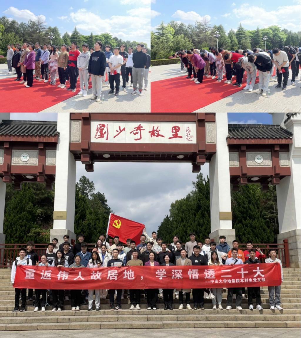 为深入学习贯彻习近平新时代中国特色社会主义思想,全面学习贯彻党的二十大精神,巩固深化“不忘初心、牢记使命”主题教育和党史学习教育成果,扎实开展好学习贯彻习近平新时代中国特色社会主义思想主题教育,牢牢把握“学思想、强党性、重实践、建新功”总要求,持续开展“一月一课一片一实践”活动,2023年4月25日,在院党委副书记李建军老师、本科生党支部书记胡幽、何可沁、刘凯老师的带领下,地信院五个本科生党支部前往湖南省韶山市毛泽东同志故居与宁乡市刘少奇同志故居开展了以“重返伟人故居地,学深悟透二十大”为主题的教育学习实践活动。