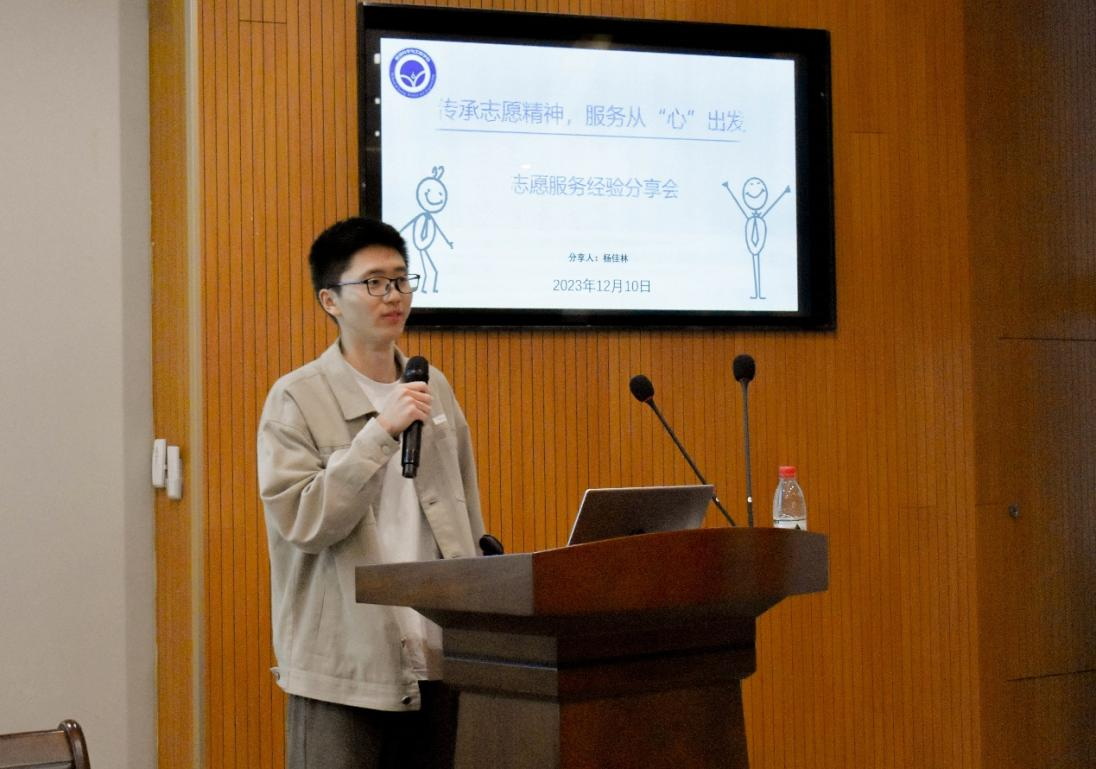 本次分享会在热烈的掌声中拉开帷幕。首先,杨佳林同学围绕“奉献、友爱、互助、进步”的志愿精神,讲述了志愿服务的意义,介绍了如何参与志愿者活动以及参与过程中的注意事项。