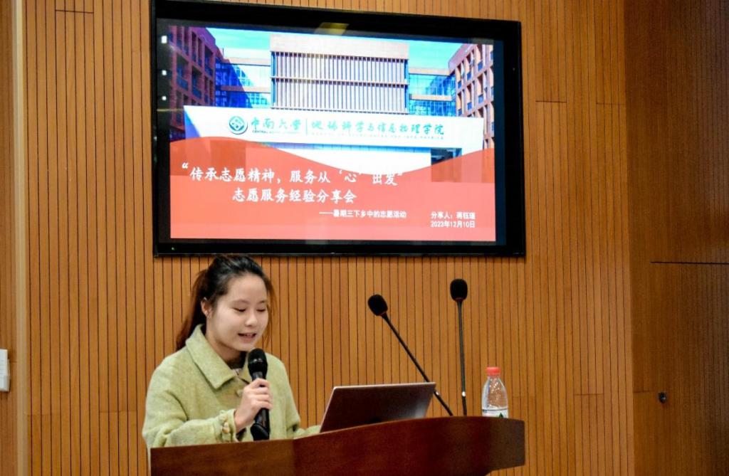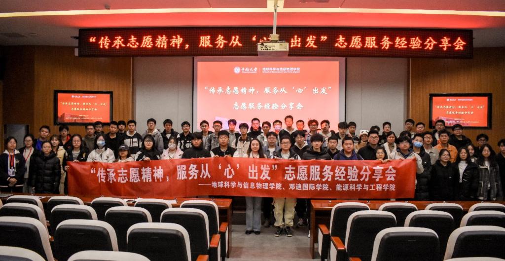 蒋钰瑾同学、邓迪国际学院胡博懿同学分享志愿服务经验,由地信院团委学生会主席团成员崔红岩同学主持,地信院团委书记刘琦及各学院2022级、2023级代表到场观看学习。