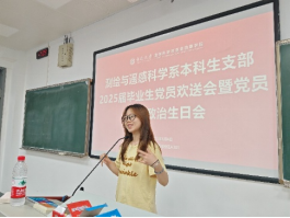 活动伊始,毕业生党员代表黄永兴同志、徐紫雯同志依次上台发言。他们深情回顾了自己这四年难忘大学生活与这一路上的成长与蜕变,分享了入党以来在理论学习和工作实践中的深刻感悟,以及在升学就业等方面的宝贵经验。黄永兴同志表示,大学四年是个人积极探索和走向成熟的重要过程,党组织的培养和教诲让他更加明确了自己的责任、使命和担当。他鼓励学弟学妹们珍惜大学时光,刻苦努力学习以提升自己的思想理论水平、广泛参与实践以提升自己的工作能力,积极在生活中发挥党员的先锋模范作用。徐紫雯同志则结合自己这四年的学习工作经历,分享了自己在面对困难和挫折时如何坚守初心、以积极乐观的心态克服这些问题和挑战。她希望大家无论未来选择了怎样的道路,都要始终铭记自己党员的身份,积极发扬党员的优良作风,为国家、为社会、为人民贡献自己的一份力量。两位毕业生党员的发言情真意切,赢得了阵阵掌声。随后,赵乐同志为2025届毕业生党员颁发了《中国共产党为什么能》系列图书。毕业生党员们在温暖的氛围中深切感受到了党组织的关怀,强化了自身对支部的集体荣誉感与归属感。