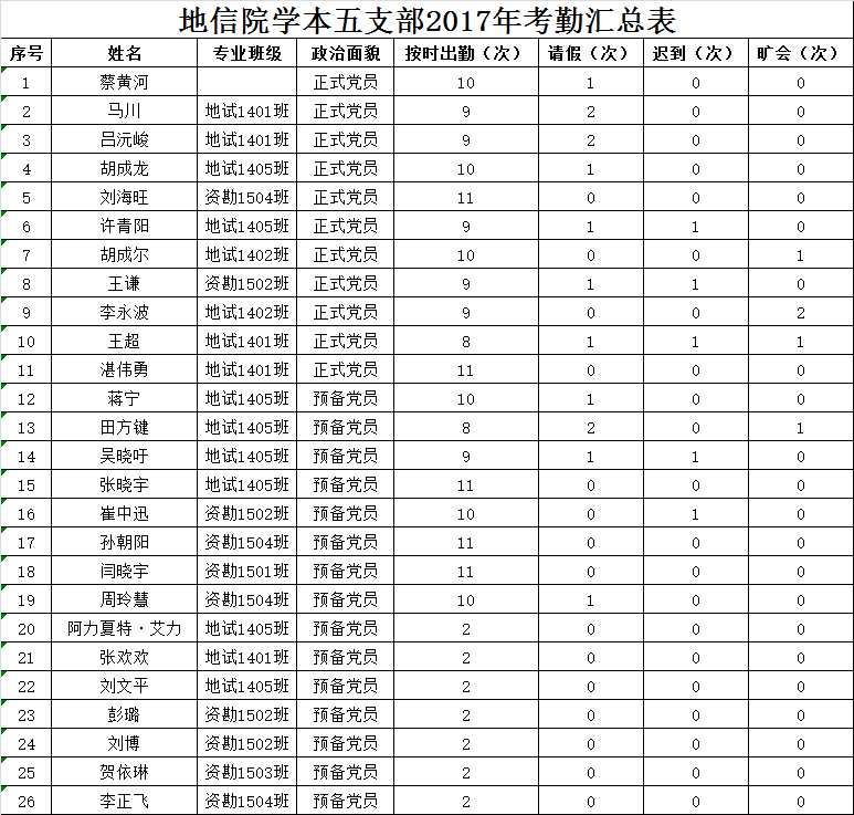 现将地信院学本五支部2017年度各类会议活动考勤情况汇总公示如下,接受党内外群众监督: