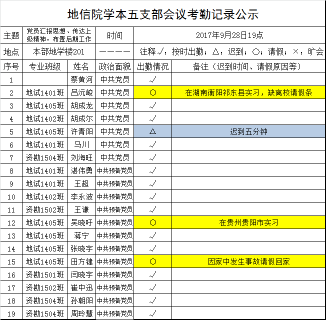 2017年9月28日地信院学本五支部会议考勤公示