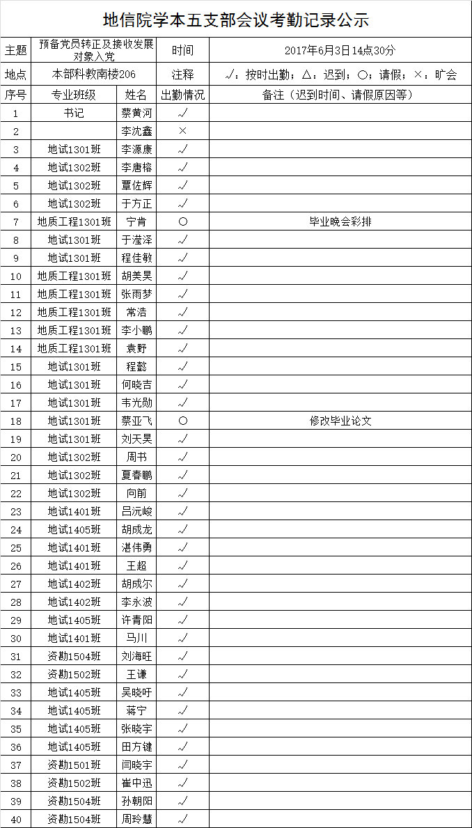2017年6月3日下午,地信院学本五支部召开支部全体党员大会,讨论预备党员转正及接收发展对象入党。将出勤情况公示如下,接受群众监督。