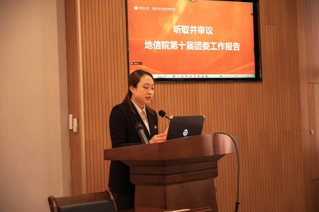 随后,地信院团委书记刘琦、地信院第十二届学生会主席梁泉、地信院第十二届研究生会主席解雪松分别代表学院第十届团委工作委员会、第十二届学生会和研究生会执行委员会向大会作工作报告,大会全体代表审议并一致通过了工作报告。