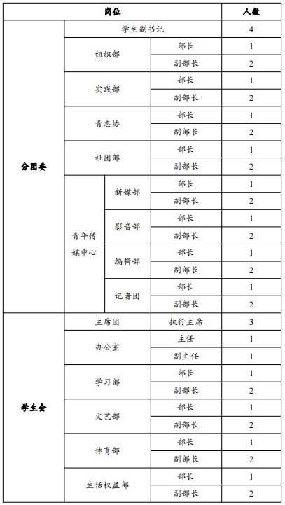 5.原则上竞选学生会主席团、分团委学生副书记职位者须有一年及以上分团委、学生会主要干部任职经验;如竞聘人在其他校级学生组织、党支部、团支部、班委会、社团及其他学生组织有一年及以上工作经历且能力突出者,也可参与竞选。