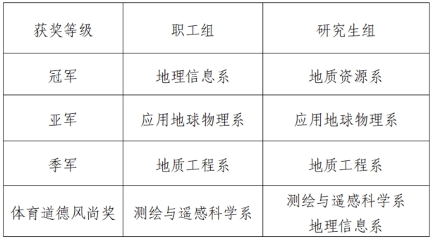 根据《关于举办2025年“大地之子杯”研究生师生篮球比赛的通知》,各专业师生的积极响应和报名参加这次师生篮球比赛,共有9支队伍参赛。比赛中,各队秉持“友谊第一,比赛第二”的精神,顽强拼搏,展现了高超的球技和良好的团队协作。经过激烈角逐,比赛结果已经揭晓,现将获奖队伍名单公布如下: