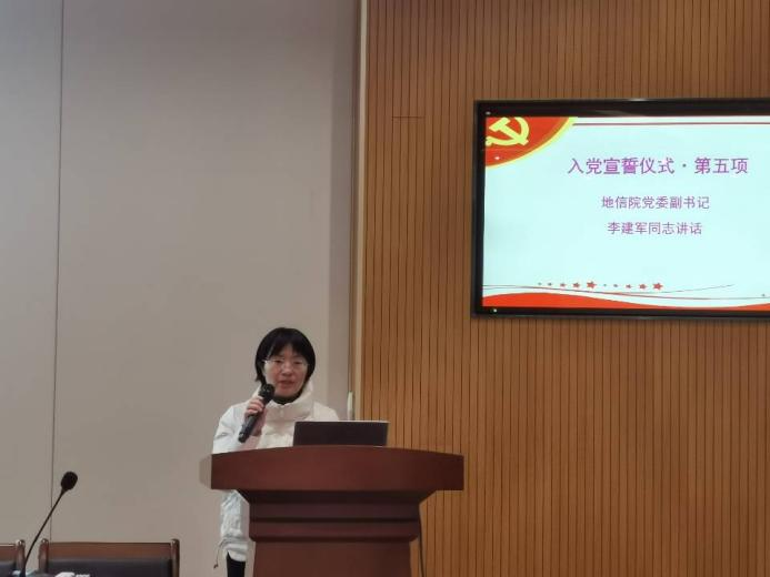 会议第五项,地信院党委副书记李建军同志讲话。李建军同志首先代表学院党委向新加入党组织的同志们表示诚挚的祝贺。她强调入党宣誓是政治生活的一个新起点,也是大家今后生活、学习、工作的一个新开端。李书记激励全体同志勇担时代重任,把青春奋斗融入党和人民事业,成为实现中华民族伟大复兴的先锋力量。