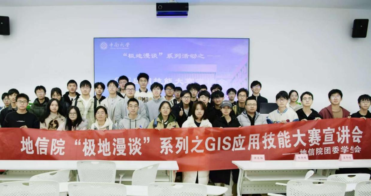 为进一步帮助地信学子全面掌握GIS应用技能大赛的相关知识技巧,助力地信院学子把握竞赛机遇,“极地漫谈”系列之GIS应用技能大赛宣讲会于2025年12月20日15:00在岳麓山校区三五食堂三楼智联厅顺利举行。本次活动由地信院团委大学生科技协会主办,蒋梦怡同学主持,学院各年级总计55名学生参会。